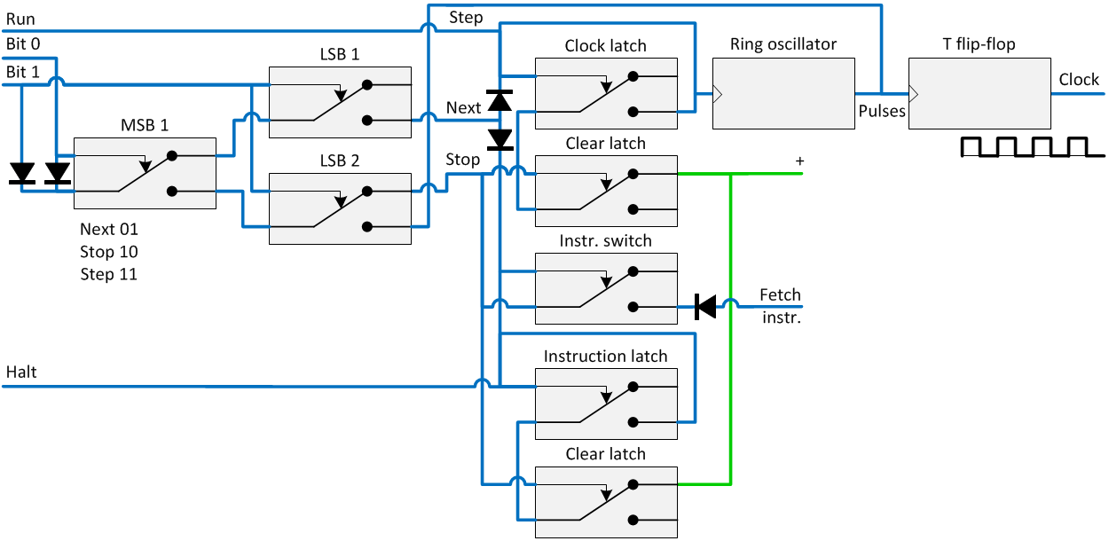 The control lines originate in the console. The Step, Next and Stop signals are coded, because the console uses a 50pin connector and are not enough lines available to give every signal its own line/pin. Run will start the clock and Stop will stop the clock. Step will execute one microcode step, Next will execute the next instruction and Halt will stop the clock only when the instruction is finished. Fetch instruction is the microcode signal that fetches a new instruction start address from the instruction map. The relay logic for the clock is shown in the next circuit diagram.