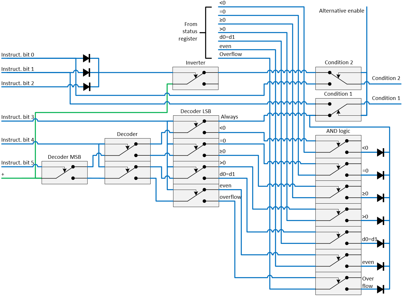 The condition decoder determines the values of both conditions and is shown in the next circuit diagram. The jump condition (bit 3– bit 5) is feed through a decoder resulting in only one line being 1. The corresponding AND-port will feed the status bit from the status register to the condition 1 output. Condition 2 is set to 1 when bit 0 – bit 2 are all 0. The alternative condition set connects bit 1 to condition 1 and bit 0 to condition 2