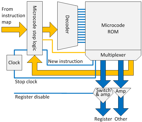 MERCIA uses another and unique approach, based on a an instruction map and microcode ROM. The so called instruction map generates all the properties of an instruction. One of those is the start address for the microcode. For different conditions, different start addresses are kept in this instruction map. The microcode ROM generates the necessary signals: the signal lines are represented by the columns and the microcode steps by the rows. Each instruction is executed by the signals contained in several microcode steps and thus rows. Each microcode step also contains the address of the next microcode step as well as a bit that indicates a new instruction and therewith start address must be loaded.