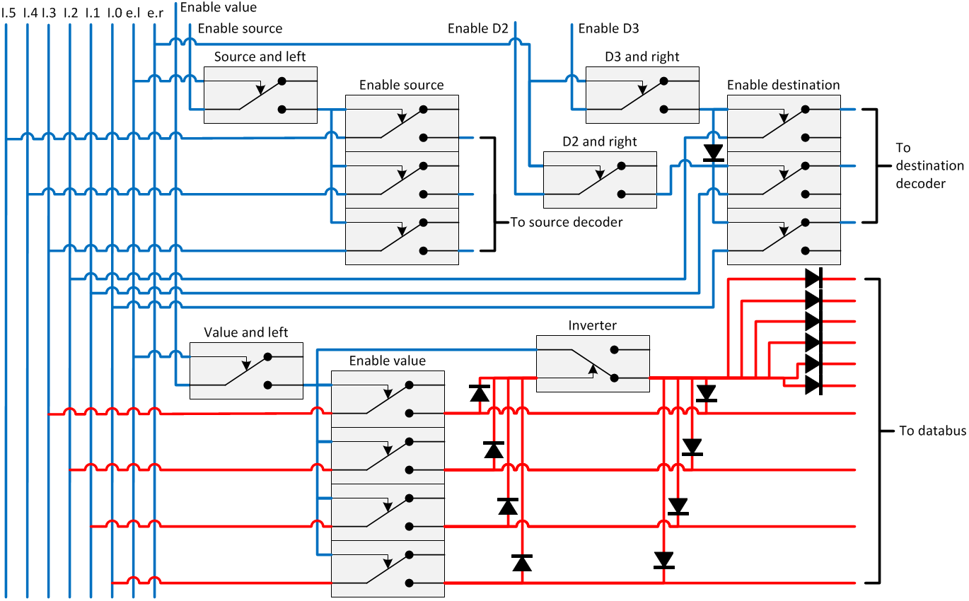 MERCIA has instructions with a maximum of two operands, so the operands are activated by two microcode signal lines (left and right). Left (l) will activate the first operand, right (r) will activate the second operand. Three representative operand enablers are sketched in the next circuit diagram: