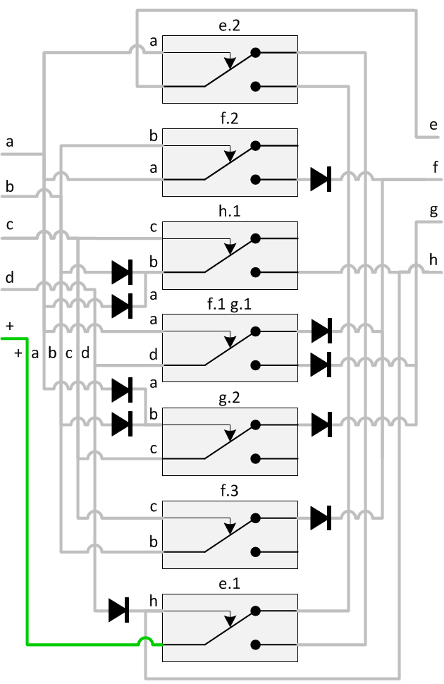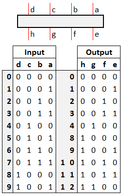 The input of this special adder contains four bit (a-d), also the output has four bit (e-h). The transformation logic functions to convert the input to the output and add 3 when larger than 4, are given below. h := d OR (c AND (b OR a)) g := (d AND a) OR (c AND NOT (b OR a)) f := (d AND NOT a) OR (b AND a) OR (b AND NOT c) e := a XOR h The truth table for this special add function is shown to the right. |