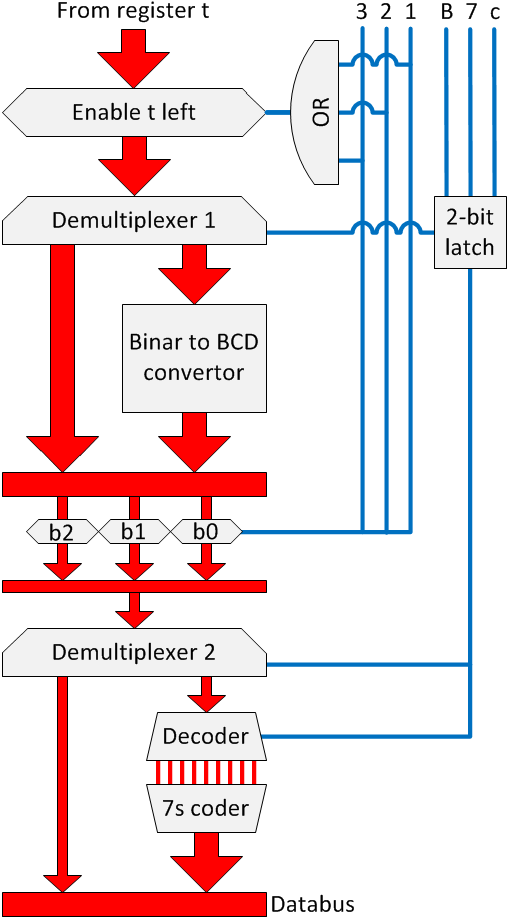 This conversion can be done by the ALU, but would be very time consuming because two 10-bit words are involved in the conversion. Therefore I choose a hardware implementation. A good description for this hardware implementation can be found here: http://www.johnloomis.org/ece314/notes/devices/binary_to_BCD/bin_to_bcd.html