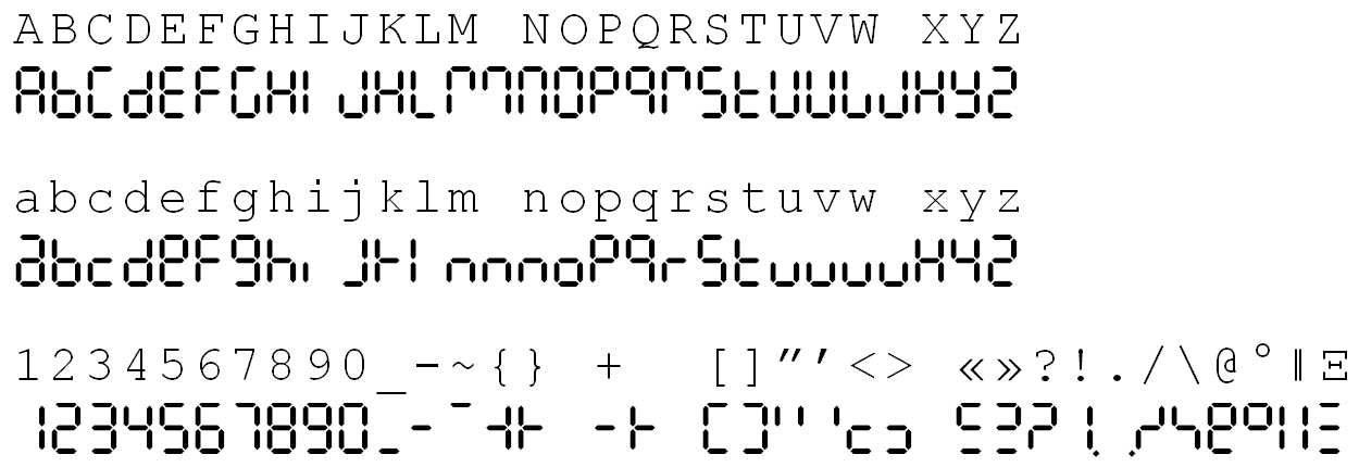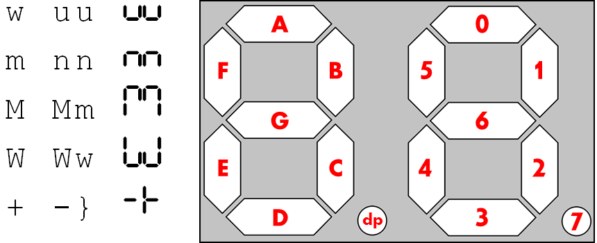 MERCIA has a ten digit 7-segment display to display messages to the user. For development purposes, a special 7-segment font has been created. It is the most extensive 7-segment font available and can be downloaded here. This MmERCIA font has the following characters.